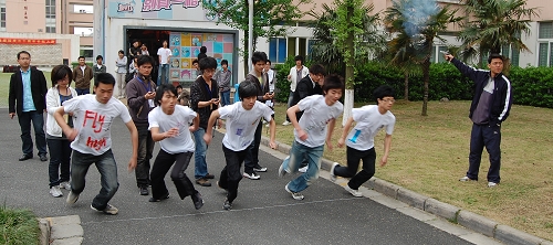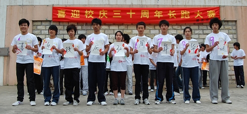 一声清脆的发令枪响破长空,每对队员如离弦的剑般奋力向着第一接力点冲去。不同于往常接力长跑大赛的是,每位队员在经过接力区时要拿一个相应的字牌,最后各班9位队员在终点处汇合,组成“喜迎校庆30周年华诞”9个大字,借此表达建艺学子对母校30周年校庆的喜悦自情。虽然,途中有人绊倒,有人擦伤,有人出现失误,但是中途没有一人放弃,运动员们不悲不弃的精神深深感染了在场的每一个人。沿途的拉拉队员也都尽心尽责,为班级同学送水,拿衣服,同学间的友谊之情洋溢在彼此之间。这个下午,呐喊声,加油声,欢声,笑声,充满了校园。