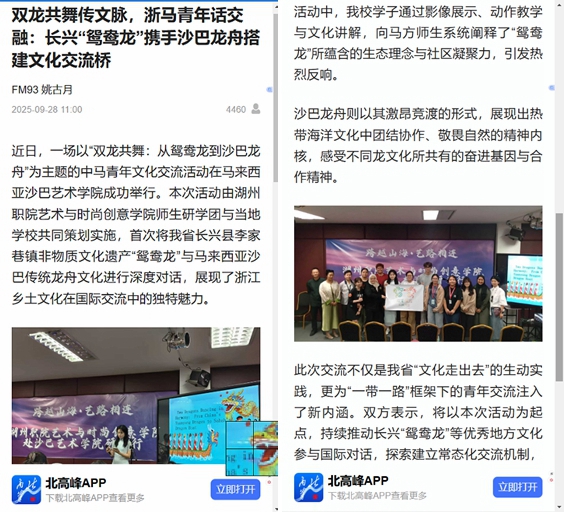 2025年9月28日《北高峰》报道我校艺术与时尚创意学院师生与当地学校共同策划实施以“双龙共舞:从鸳鸯龙到沙巴龙舟”为主题的中马青年文化交流活动的相关新闻。