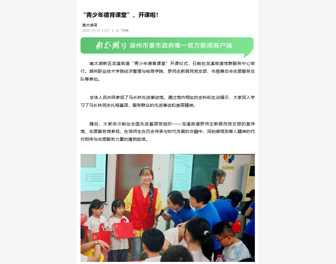 2025年10月15日《南太湖号》报道了我校经济管理与电商学院发起的“青少年德育课堂”正式开课的相关新闻。