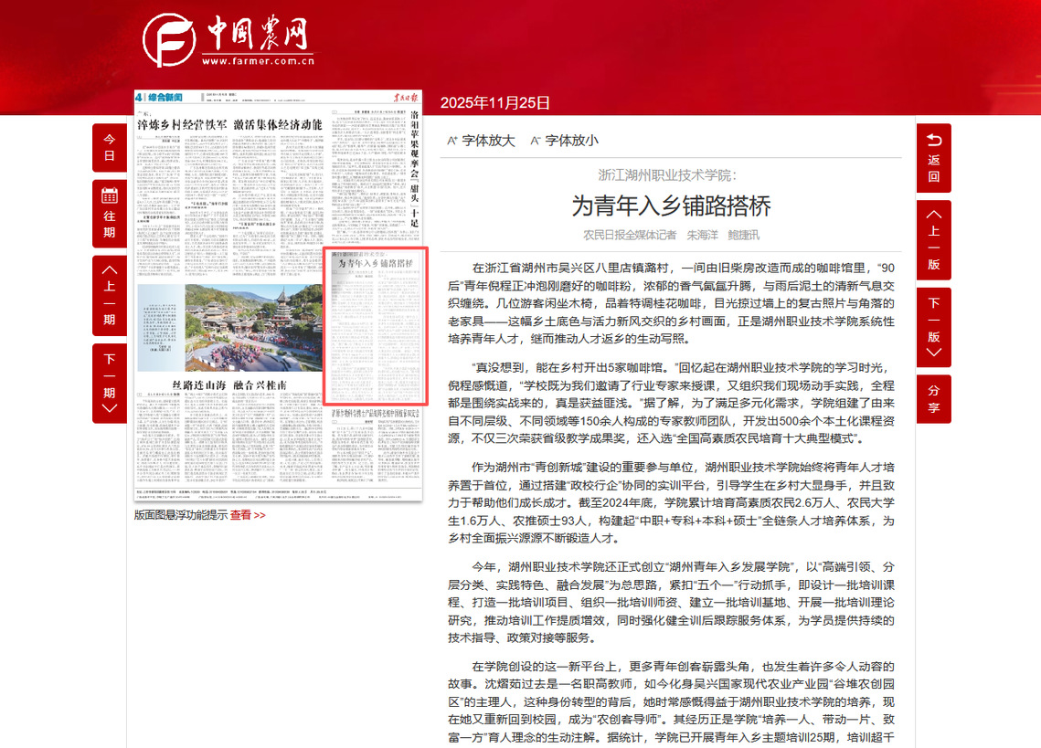 2025年11月12日《农民日报以及其客户端,报道学校充分发挥“湖州青年入乡发展学院”平台优势,开展青年入乡主题培训的相关新闻。