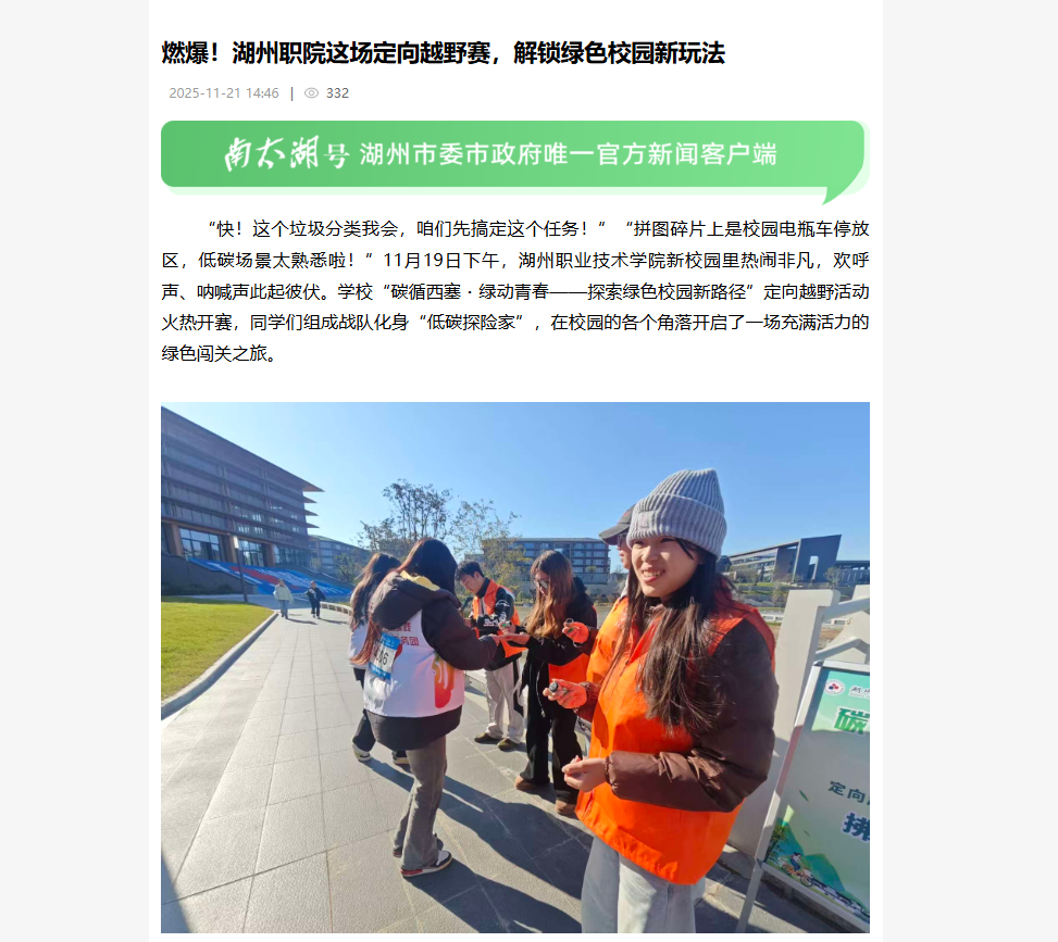 2025年11月21日《澎湃新闻》《今日头条》《南太湖号》报道学校将运动竞技与低碳教育深度融合开展定向越野赛的相关新闻。